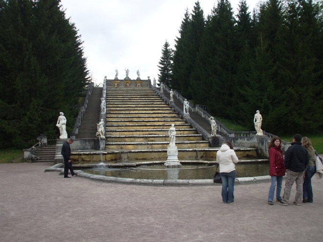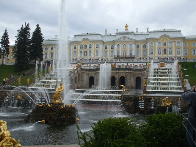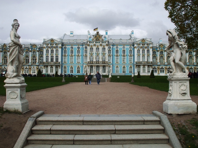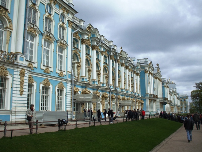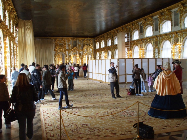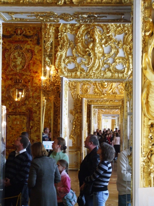 Heute haben wir es im Gegensatz zum vorherigen Tag pünktlich zum Frühstück geschafft, da wir heute ja genau wussten, wann es inoffiziell losgeht. Nach dem Essen sind wir dann zum Bahnhof Vitjebskij gegangen und sind dann nach Detskoje Selo (heißt übersetzt Kinderdorf) gefahren, wo wir zum dortigen Sommersitz der Zarin Katharina II. gelaufen sind. Die Suche nach dem Eingang gestaltete sich als etwas schwierig, da wir von einem Mann erstens fehlgeleitet worden sind und es zweitens einen Eingang für Gruppen gibt und einen weiteren für Einzelpersonen. Zudem gibt es getrennte Öffnungszeiten für beide Kategorien, so dass wir als Einzelne nur von 12-14 Uhr in das Schloss konnten. Wer zum Schloss will, der muss durch den großen Park gehen, für den man zusätzlich noch Eintritt bezahlen muss - wie im Schloss auch gibt es hier ermäßigte Preise, normale Preise und dann noch die völlig überteuerten Touristenpreise. Wir haben es wieder so gemacht, dass wir uns als "Russen" getarnt haben und so zu fairen Preisen überall hereingekommen sind. Vor dem Schloss mussten wir noch eine ganze Zeit in der Schlange stehen, bevor wir dort überhaupt hineingekommen sind und mussten uns dann einer Führung anschließend, die zwar auf Russisch, aber dennoch sehr interessant war. Besonders im II. Weltkrieg ist die Geschichte des Schloss sehr bewegend: Es wurde von deutschen Truppen eingenommen und für 28 Monate als Kaserne benutzt und letztendlich als völliger Totalschaden durch Russland zurückerobert. Später ist von deutscher Seite viel Geld für die Renovierung des wunderschönen Schlosses bezahlt worden. In dem Schloss gibt es auch das berühmte Bernsteinzimmer, allerdings ist es nur eine nachgemachte Kopie, die von einem deutschen Konzern finanziert worden ist. Dadurch, dass das Zimmer über und über mit Bernstein in vielen verschiedenen Farben geschmückt ist, zeigt sich ein besonders schönes und warmes Flair. Doch auch hier schien es, als würden noch Gemälde fehlen, die im Verlauf des II. Weltkriegs verschwunden und verschleppt worden sind. Nun weiß keiner mehr so richtig, wo es zu finden ist. Beeindruckend sind auch die ganzen anderen Zimmer mit ihren Goldverzierungen und dem ganzen Prunk. Schön ist auch, dass es nicht überladen ist mit Kunst und Schmuck. Am Ausgang des Museums gab es für uns dann noch eine Überraschung. Mein Vater hat gemeinsam mit Masha einen Prospekt über das Schloss gekauft und die Kassiererin hat ihr dafür eine Verkaufsprovision von 10% gegeben, was uns alle sehr gefreut und überrascht hat.