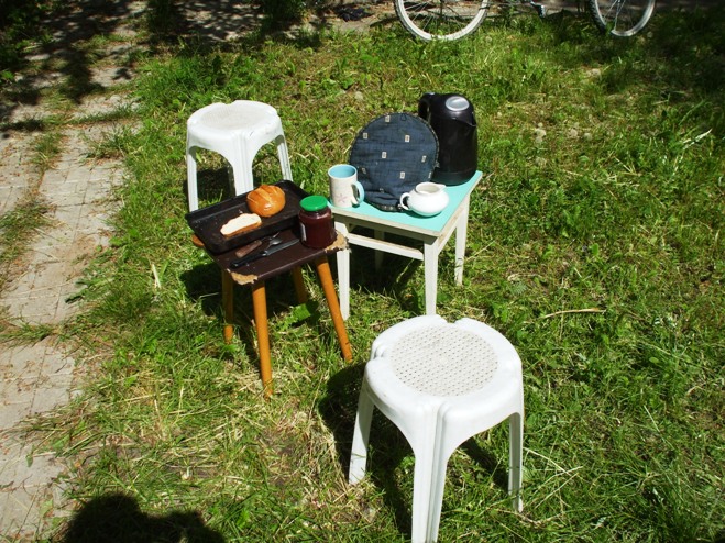 ...was zweierlei Dinge zur Folge hatte: Erstens musste ich nachts zwei Male zur Toilette - die befindet sich jedoch im Garten, wo ich nachts durch die Dunkelheit hinfinden musste. Die Wege sind ein wenig schmal und mir bis dahin unbekannt. Da es dort nur einen Auffangbehälter ähnlich einem Dixi-Klo gibt, habe ich nachts halb verschlafen den Spülknopf gesucht. Am nächsten Morgen bin ich dann um 10:30 Uhr aufgestanden, nachdem ich gehört habe, dass sich jemand in der Küche gewaschen hat, neben der ich schlafe. Dann habe ich für die Familie etwas zum Frühstück gemacht und mit Mashas Eltern gefrühstückt. Kurz nachdem wir angefangen hatten, ist Masha auch mit dazu gekommen. Nach dem Frühstück haben wir erst ein paar Fotos in den herrlichen Blumen gemacht und zwei Fahrräder "mobil" gemacht und wir beide sind einkaufen gefahren. Endlich hatte ich also wieder die Möglichkeit, Fahrrad zu fahren. Es ist doch eine Sache, die ich etwas vermisst habe. Wenn man etwas wiederentdeckt, dann kann man doch manchmal merken, wie sehr einem etwas fehlt. Eigentlich wollten wir noch eine kleine Radtour machen, aber die Zeit reichte dann doch nicht mehr dazu aus. Zwischendurch hatte ich noch ein wenig Zeit zum fotografieren und nach unserer Rückkehr habe ich dann das Mittagessen zubereitet. Das Kochen ist ein bisschen meine Aufgabe hier geworden. Zwischendurch sind dann Lisa und Ljoscha gekommen - Sergej ist später nachgekommen. Am Nachmittag haben Masha und ich dann ihre beiden Freundinnen am Bahnhof abgeholt und hatten auf dem Rückweg sehr viel Spaß und wir haben viel herumgealbert. Ich habe dann noch ein wenig im Garten geholfen und die schöne Löwenzahnblütenpracht an die Seite geräumt, die Sergej mit der Sense gemäht hat. Extra für mich ist aber eine kleine Ecke der Blütenpracht stehen geblieben. Ich verstehe ja, dass die Pflanzen alle weg müssen, da sie sich sonst noch unbändiger fortpflanzen, aber andererseits geben sie ein herrliches Bild ab. Anschließend habe ich Zeit gefunden, etwas im Tagebuch zu schreiben, musste aber auf den Akku achten, da der Strom ausgefallen ist. Das bedeutet aber gleichzeitig auch, dass kein Wasser fließt, da das Wasser in einem Gefälle aus einem Wasserturm in die Häuser kommt und der Turm mit einer Elektropumpe angefüllt wird... So wollen wir mal schauen, wann das hier alles wieder funktioniert. Kaum, dass ich diesen Satz zu Ende geschrieben habe, ist der Strom auch schon wieder da.