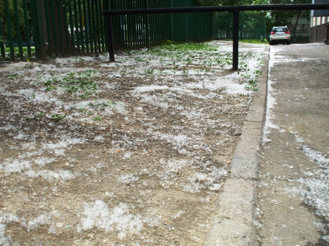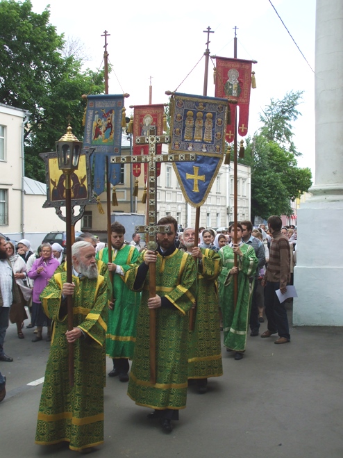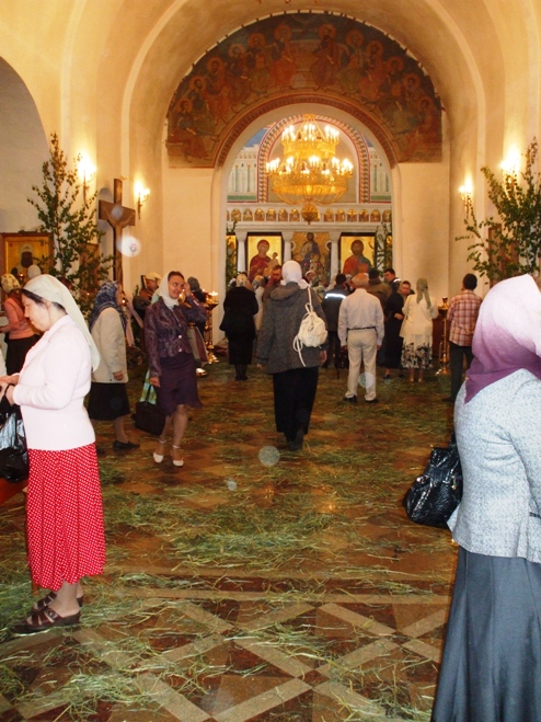 Nachdem ich das Gepäck bei Masha untergestellt habe, bin ich dann direkt zur Kirche gegangen und es hat sich voll bewahrheitet, was Katja am Vorabend angedeutet hat: Es ist ein Feiertag, es sind viele Leute zum Beichten da und dementsprechend beginnt die Göttliche Liturgie erst später. Ich war also um 10:10 Uhr in der Kirche und just in dem Moment öffneten sich die Zarentüren und die Liturgie begann. In der Pfingstliturgie gibt es einige Besonderheiten - einmal wurden heute erstmals seit dem Osterfest die Lieder gesungen, die sonst vor und nach den Vorlesungen in der Uni gesungen werden und dann war die Kirche außergewöhnlich geschmückt. Die Birkenzweige in einigen Ecken waren noch recht normal, aber dass der Boden mit langem, aber recht frischen Gras ausgelegt war, war dann doch sehr ungewöhnlich und machte einen beinahe weihnachtlichen Eindruck. Warum weihnachtlich? Es roch zum einen wunderschön danach in der Kirche und zweitens sah es ein wenig aus wie in einer Scheune oder einem Stall - und dort wurde Jesus Christus doch nach der katholischen Tradition geboren. Draußen spielten die zahlreichen Kinder mit dem Gras, das wohl nicht benötigt wurde für die Kirche. Die Liturgen trugen heute (passend) grüne Gewänder und hatten nach der Prozession in der anschließenden Vetschernja einen Blumenstrauß in der Hand. Dazu gehörten drei lange Gebete, die von den Priestern in den geöffneten Zarentüren mit Blick zur Gemeinde gelesen wurden - auf Knien. Um 14 Uhr sind wir nach Hause gegangen und haben uns ein wenig mit den Weidenpollen beschäftigt, die derzeit in jeder Ecke und Kante von Moskau zu finden sind. Einige Stellen liegen so voll davon, dass man meinen könnte, es hätte geschneit. Wenn man die Fussel vorsichtig auf einen Haufen packt und hochwirft, dann kommt es einem vor, als wäre man Frau Holle oder wenn man auf so einem "Teppich" steht, sieht es aus, als stände man auf einer Wolke. So viele von den Pollen habe ich also noch nie gesehen und hoffe, dass ich es auch nicht zu häufig werde, denn ich scheine doch eine leichte Allergie dagegen zu haben. Nun regnet es mittlerweile und ich habe die Hoffnung, dass sich alles bindet und irgendwo in der Kanalisation verschwindet.