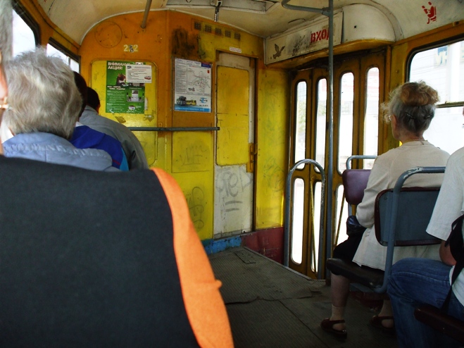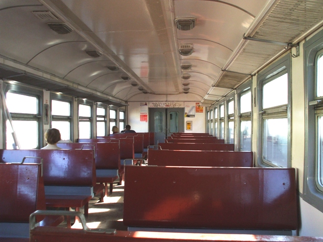 Holzbänke in der Elektritschka - in der Regel ist nur jede Bank mit drei Leuten besetzt...