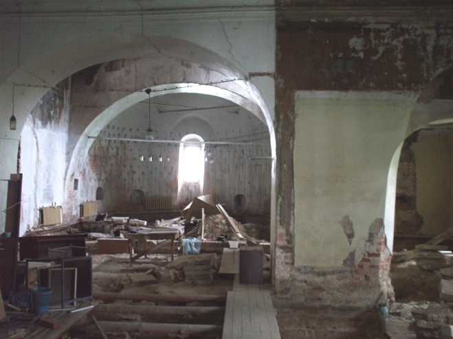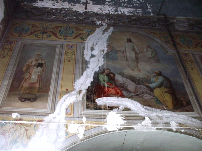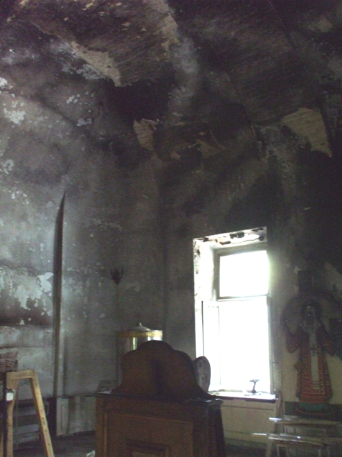 Blick ins Kirchenschiff. Links ist die Ikonostase zu sehen, gegenüber der das Feuer ausgebrochen ist.