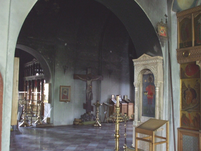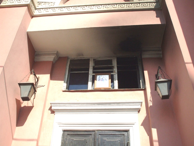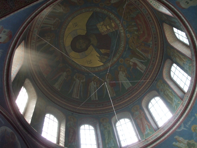 Kurz nach der Rückkehr am Nachmittag in Moskau bin ich mit Tanja dorthin gegangen und wir konnten sogar in die Kirche hineingehen. Eigentlich ist alles vom Ruß in Mitleidenschaft gezogen worden, vor allem alles jenseits der Kuppel in Richtung Verkaufsrecke und Ausgang ist so gut wie schwarz. An dem Brandherd selbst ist der Putz von der Decke gekommen, einige Fensterscheiben sind zersprungen, die Ikonostase gegenüber dem Stand ist beschädigt und bei einigen Ikonen ist die Farbe abgeblättert und so gut wie alle Deckenmalereien müssen sicherlich auch erneuert werden, weil sie dunkler bzw. rußig geworden sind. Alles in allem hätte es noch schlimmer kommen können, aber der Schaden ist doch beträchtlich und ein gewaltiger Rückschritt in der schon länger währenden Renovierungsgeschichte der Kirche.