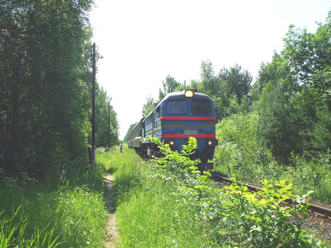 Heute hätte ich vielleicht die Möglichkeit gehabt, auf einer Dampflokomotive mitzufahren, aber der Lokführer hat uns leider abgesagt. So war der Tag für mich mehr oder minder frei und ich habe den Wecker nicht gestellt. Wach geworden bin ich durch leises Gerappel in der Küche, wo Mashas Mutter gerade das Frühstück vorbereitet hat. Anschließend war noch ein bisschen Zeit und ich habe den geplanten Ausflug konkretisiert und organisiert. Ich wusste nach dem Aufstehen noch nicht, ob ich wirklich fahren würde, da Gewitter bzw. Regen sich mit Sonnenschein abwechselte. Als ich los musste, hörte ein Schauer gerade auf und Masha hat mich bis zur Straße im Wald gebracht, von wo ich alleine weitergelaufen bin. Der Weg zum Bahnhof war schon fast beschwerlich, weil die Luft so drückend-heiß war, dass man nicht richtig Luft holen konnte. Die Gewitterschauer ohne Abkühlung taten ihr Übliches dazu. Nachdem ich das Ticket gekauft hatte kam dann auch schon bald der Zug, mit dem ich bis nach Kaschira gefahren bin. Vor der Einfahrt in den Bahnhof hat der Zug eine große Eisenbahnbrücke über einen Fluss zu überquert, von dem man die Stadt Kaschira gut sehen konnte, da sie auf einem Hügel am Ufer liegt. Dort gibt es viele Kirchen und am gegenüberliegenden Ufer ein Kloster. Dort hatte ich nun eine kurze Zeit Aufenthalt, bis die Elektritschka nach Usunova kam. Nach einer einstündigen Fahrt bin ich dann an meinem Ziel angekommen und war sehr erstaunt von der Größe des Ortes, an dem alle Fernverkehrszüge halten und eine neue Maschine vorgespannt bekommen: Wenn dort 500 Menschen leben, dann ist das wohl schon übertrieben. Auch ist dies kein Kurort oder gibt es dort eine Touristenattraktion - es ist einfach ein Eisenbahnerdorf in der Landschaft mit einem recht großen Lokomotivdepot und Wartungsanlagen, recht umfangreichen Gleisanlagen, vier Bahnsteigen, einer Polizeistation, einigen Güterwaggonkästen, die zu Garagen und Schuppen umfunktioniert wurden, zwei alten Wassertürmen, einem Bahnhofsgebäude, ein paar Wohnhäusern und letztlich sieben bis acht Geschäfte, die eine wichtige Rolle in dem Ort spielen. Dort kaufen die Babuschkas oder älteren Frauen ihre Waren ein, die sie dann zwanzig Meter weiter auf dem Bahnsteig am Zug verkaufen. Der Bahnhof wird lebendig, wenn ein Fernreisezug einfährt: Zunächst rollt der Zug mit oft 20 Waggons langsam in den Bahnhof ein und der Bahnsteig ist schon von den Frauen mit ihren Gepäckkarren belagert, wo Kuchen, Getränke, Trockenfisch und andere kleine Snacks zu finden sind. Die Türen von dem Zug gehen auf, zumeist kommt zuerst die Waggonschaffnerin heraus und dann die Reisenden, die rauchen oder bei den Frauen einkaufen wollen, die vor sich hin sprechend ihre Waren feilbieten. Währenddessen wird die Lokomotive abgekuppelt und eine neue davor gesetzt, die den Zug dann bis zum nächsten Etappenziel bringt. Vor den Türen stehen die Waggonschaffnerinnen - in der Regel sind es Frauen - in ihren adretten Uniformen und scheinen, wenn ich es richtig mitbekommen habe, selbst Waren zu verkaufen, da in ihrer Nähe Trockenfisch an den Trittbrettern und den Türen hing - anderer als die Frauen angeboten haben. Und sie wollten auch nicht fotografiert werden damit. An das Fotografierverbot habe ich mich übrigens nur bedingt gehalten und aus sicherer Entfernung Bilder gemacht. Ich bin dann von einem Eisenbahnmitarbeiter angesprochen worden, warum ich Fotos mache und habe ihm dann erklärt, dass mich das Leben an einem solchen Unterwegsbahnhof "in der Pampa" sehr interessiert und mein Vater ebenfalls bei der Bahn arbeiten würde. Dann war er beruhigt. Anders als ein "Rangierer", dessen Aufgabe es ist, die Waggons an- und abzukuppeln von den Lokomotiven. Er hat mir mit der Miliz gedroht, sollte ich weiter fotografieren. Ich habe mich dann etwas zurückgezogen und wollte erst von einem Bahnübergang aus fotografieren, habe dort aber Probleme gehabt, weil überall Masten und Oberleitungen im Weg waren und es zu regnen anfing. Trotz einem sogenannten Verbot, Regenwetter und Strommasten habe ich nach zwei Eis noch ein paar Bilder gemacht: Quasi aus der Deckung heraus aus dem Fenster der Elektritschka, mit der ich wieder zur Datscha fahren wollte.