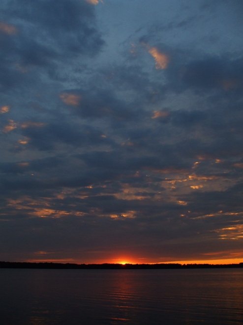 Nun geht der Dritte Tag hier zu Ende - wieder mit einen so schönen Sonnenuntergang wie an den letzten beiden Tagen. Am Nachmittag hat sich der Himmel bewölkt und die Sonne ist verschwunden und seitdem hat sich nichts geändert. Der Tag war heute wieder schön, auch wenn es nicht viel zu berichten gibt: Am Morgen bin ich aufgestanden und bin dann direkt nach draußen gegangen, um das Gras zu mähen. Gegen Mittag sollte dann ein Lebensmittelauto ins Dorf kommen. Kurz nach neun kam ein größeres Auto vorbei und ein paar Augenblicke später läutete eine Glocke. Für mich war die Wahrscheinlichkeit groß, dass das schon das Versorgungsauto ist und habe Masha holter-di-polter geweckt. Die sagte dann nur, dass das nicht sein könne und so war es dann auch. Der Transporter kam dann später - etwa gegen halb drei. Dort kann man so ziemlich alle Lebensmittel kaufen, die ein Haushalt benötigt. Es sind auch ein paar Saisonartikel wie zum Beispiel Kirschen mit dabei. Vor dem Wagen standen dann in einer Schlange jede Menge meist ältere Frauen und die Verkäuferin mit ihrem Fahrer hatte viel zu tun. Den restlichen Tag habe ich eigentlich damit verbracht, auf dem Grundstück das Gras und jede Menge anderes Unkraut wie Brennnesseln mit der Elektrosense zu mähen. Zunächst habe ich im Schatten gearbeitet dann irgendwann in der Sonne, ohne dass es mir richtig bewusst geworden ist. Dadurch habe ich mir einen schönen Sonnenbrand geholt, den wir mit Kefir bekämpft haben. Gegen halb sieben haben wir uns dann zum Bootssteg aufgemacht, wo wir dann gemeinsam baden gegangen sind. Ich habe etwas Shampoo mitgenommen, um mir in der Wolga die Haare zu waschen. Anschließend haben wir erst heißen Tee getrunken, weil uns doch etwas kalt war. Danach habe ich einen Kartoffelauflauf gemacht und wir haben uns den Sonnenuntergang angeschaut.